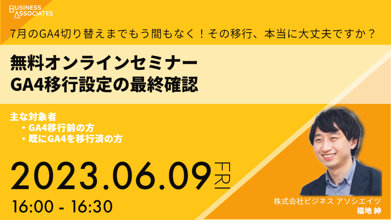 このたび株式会社ビジネス アソシエイツは、無料オンラインセミナー「GA4セミナー ~GA4移行設定の最終確認~」を2023年6月9日(金)16時より開催いたします。