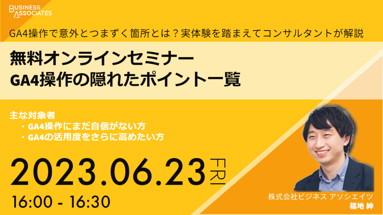 このたび株式会社ビジネス アソシエイツは、無料オンラインセミナー「GA4セミナー GA4操作で意外とつまずく箇所とは?~GA4操作の隠れたポイント一覧~」を2023年6月23日(金)16時より開催いたします!