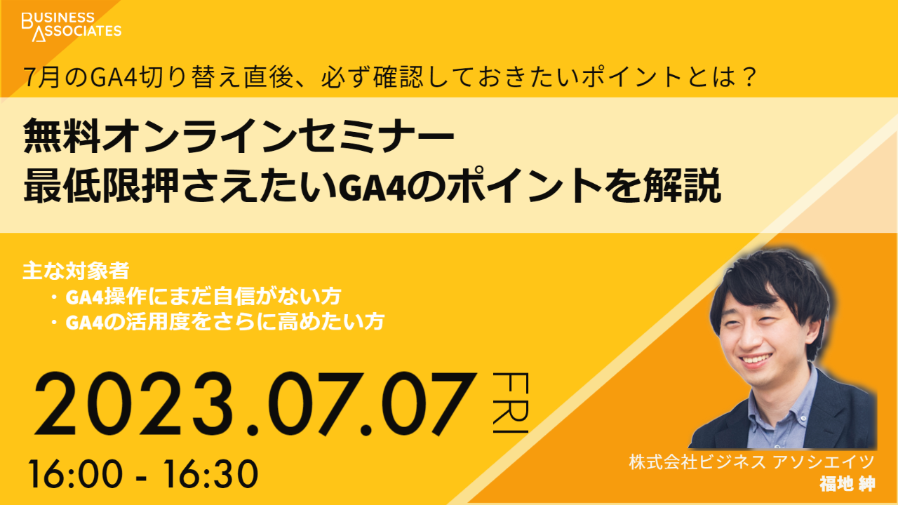 このたび株式会社ビジネス アソシエイツは、無料オンラインセミナー「7月のGA4切り替え直後、必ず確認しておきたいポイントとは? ~最低限押さえたいGA4のポイントを解説~」を2023年7月7日(金)16時より開催いたします!