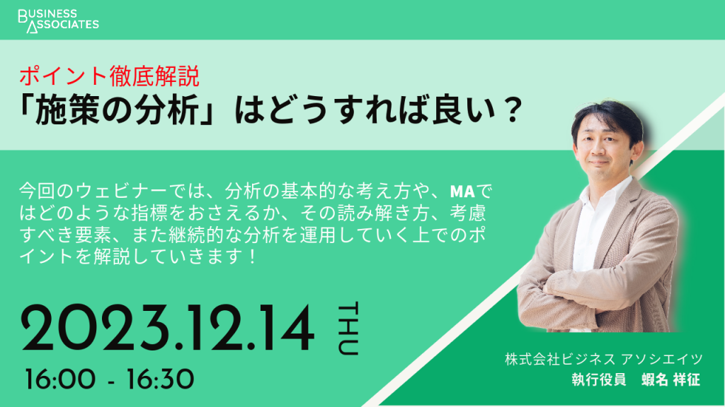 このたび株式会社ビジネス アソシエイツは、無料オンラインセミナー「【ポイント徹底解説】施策の分析はどうすれば良い?」を2023年12月14日(木)16時より開催いたします!